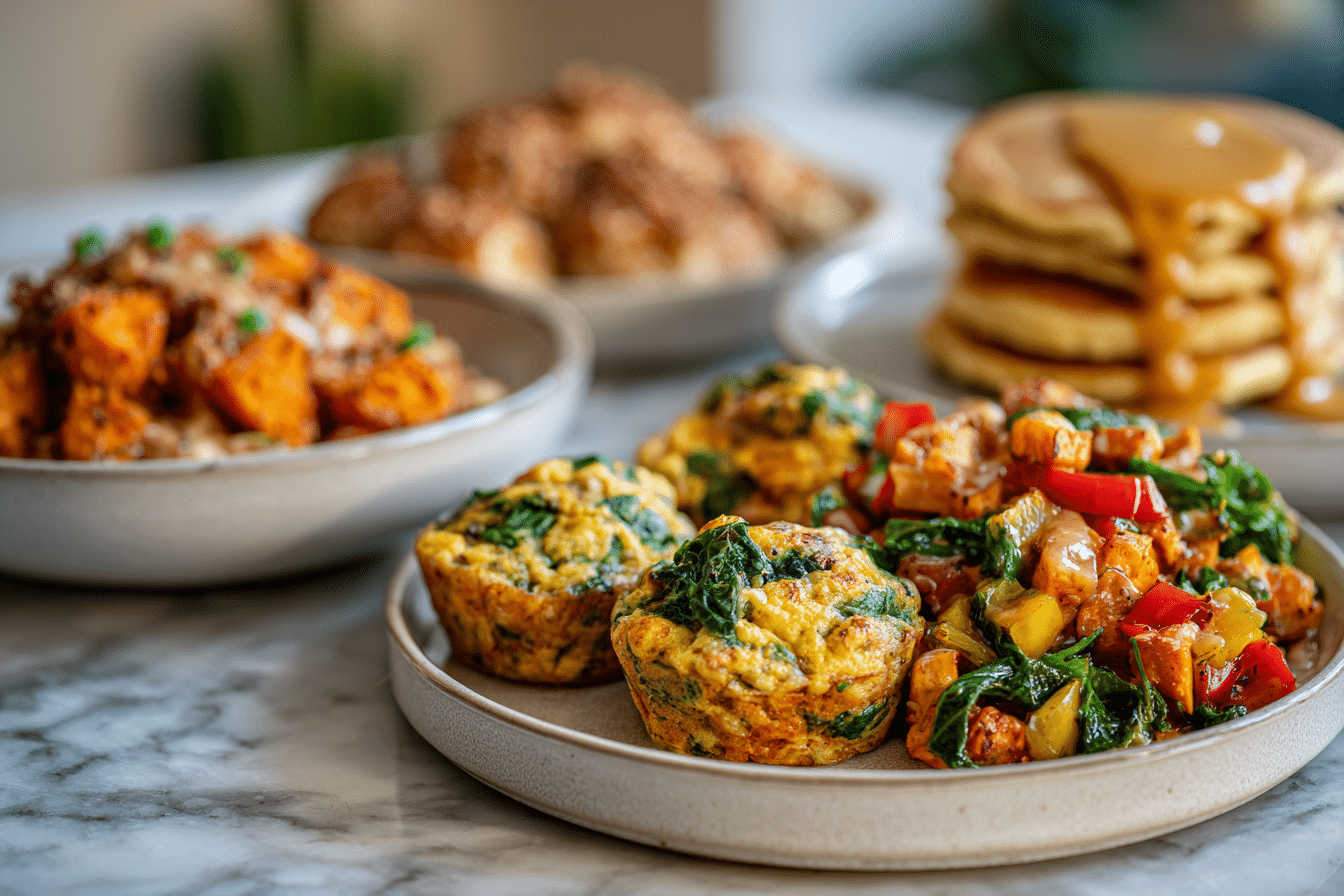 - Ingredients: Eggs, sweet potatoes, turkey sausage or tempeh, spinach