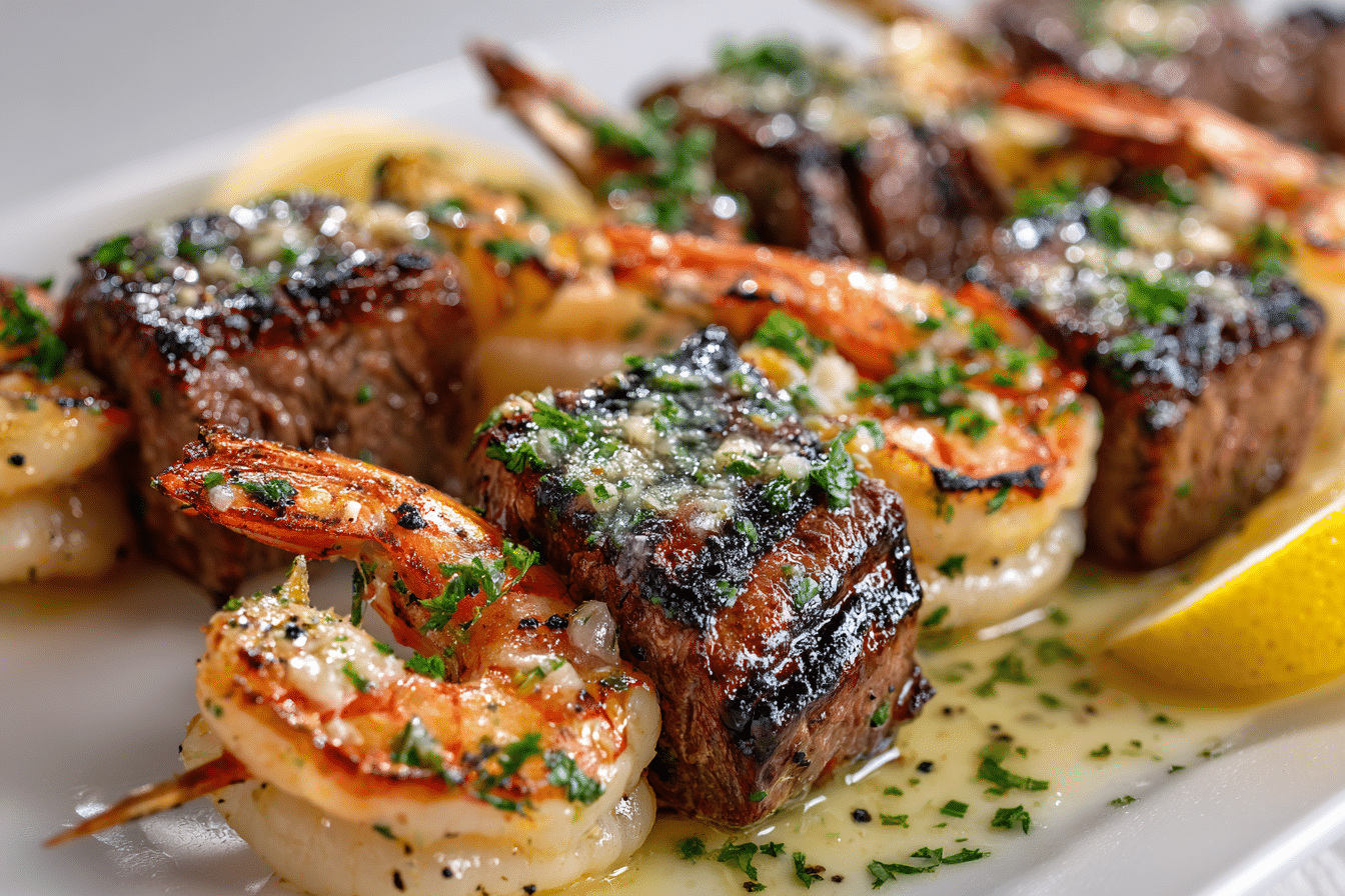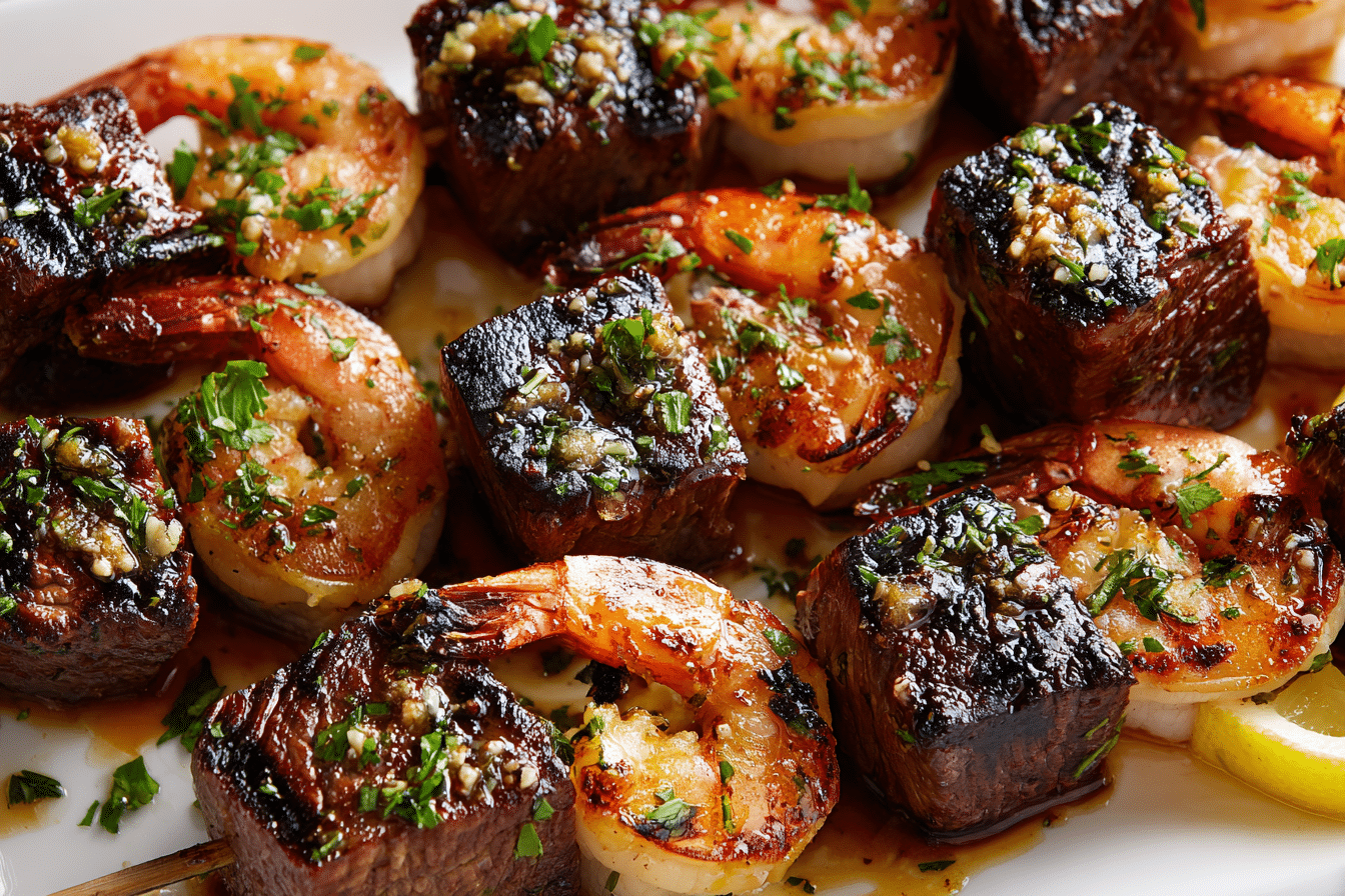 Grilled Steak and Shrimp Skewers with Garlic Butter Sauce are juicy, smoky, and packed with bold flavor. Tender steak cubes and plump shrimp are seasoned, threaded onto skewers, and grilled to perfection — then brushed with rich, garlicky butter for a restaurant-quality finish.