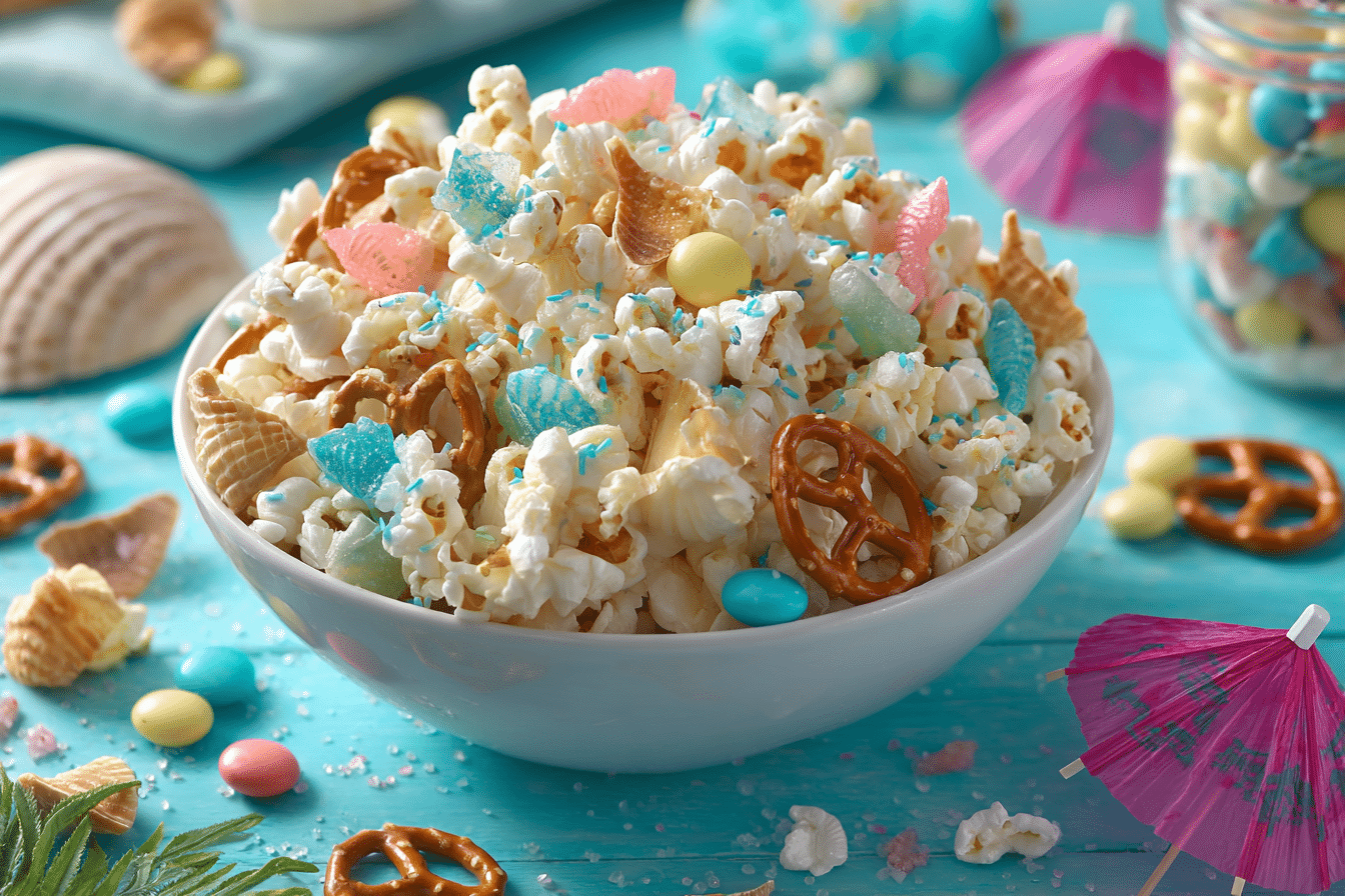Beach Party Popcorn is a fun, colorful snack that brings tropical vibes to any gathering. Light, crunchy Popcorn is mixed with sweet candies, salty snacks, and beach-themed decorations to create a festive treat perfect for summer celebrations.