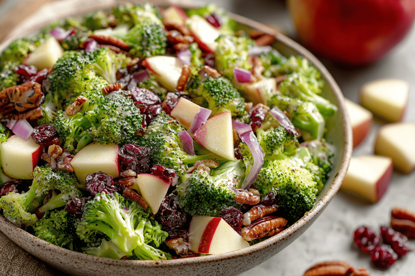 Best Broccoli Salad with Apples and Cranberries is a vibrant, crunchy salad that perfectly balances sweet, tangy, and savory flavors. Crisp broccoli florets form the base of the dish, while juicy apples and chewy cranberries add natural sweetness. A creamy dressing brings everything together, coating each ingredient with rich flavor while still allowing the freshness of the vegetables to shine.