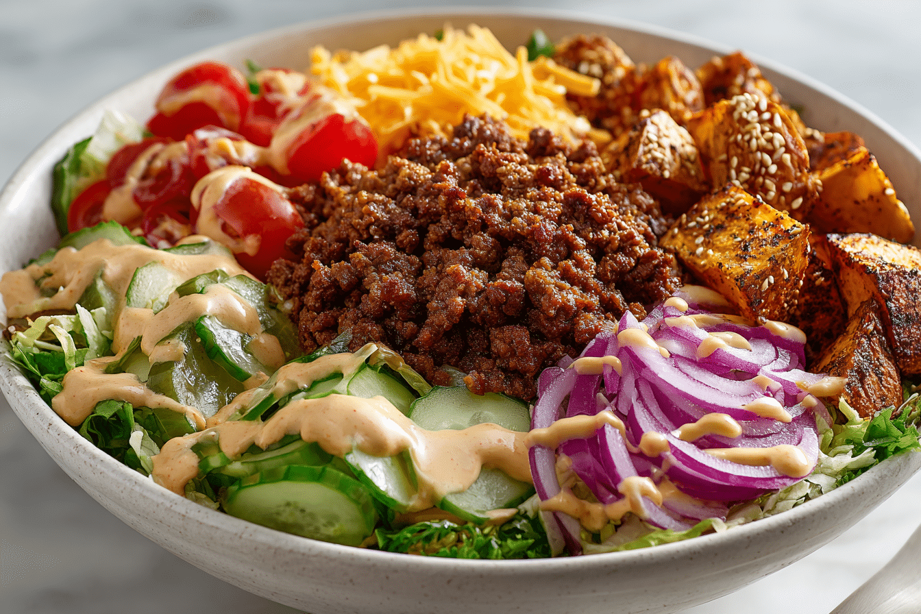 This deconstructed burger keeps everything you love: savory beef, melted cheese, crunchy pickles, and tangy sauce—just served in a bowl instead of between bread. It’s ideal for meal prep, quick dinners, or anyone looking for a lighter take on a traditional burger.