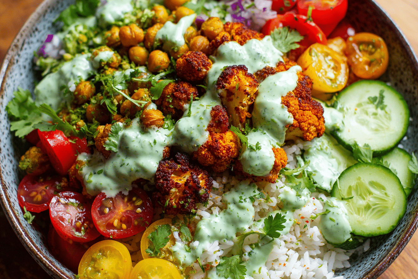 A bold, plant-based bowl featuring roasted cauliflower in shawarma spices, served over grains or greens with fresh veggies, creamy tahini, and herbs. Perfect for meal prep or nourishing dinners.