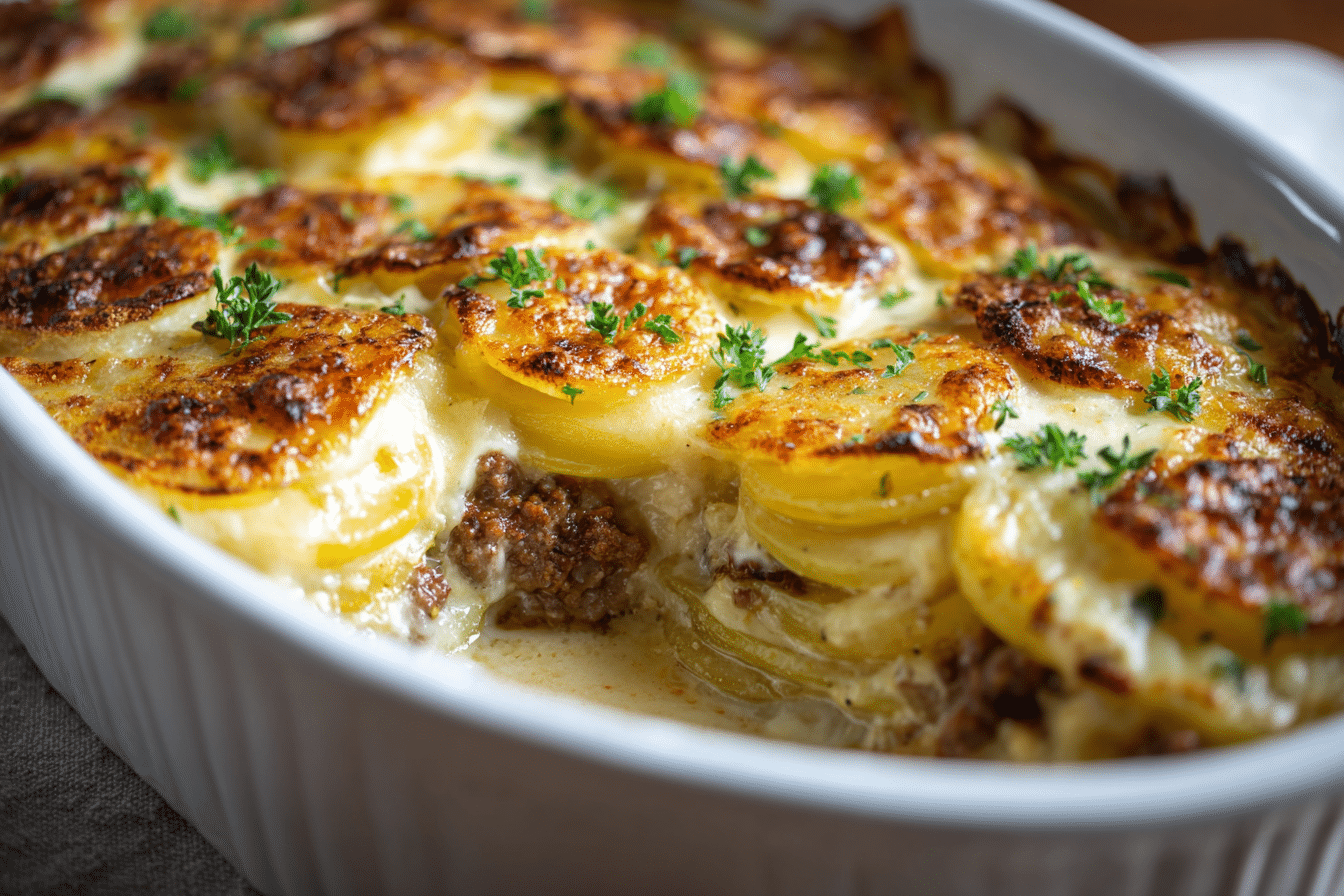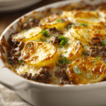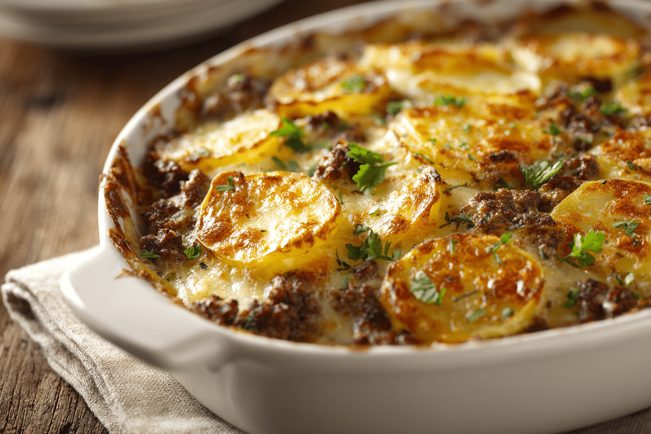 A comforting layered casserole of seasoned ground beef, thin-sliced potatoes, and cheddar cheese baked in a creamy sauce — perfect for weeknights or family gatherings.