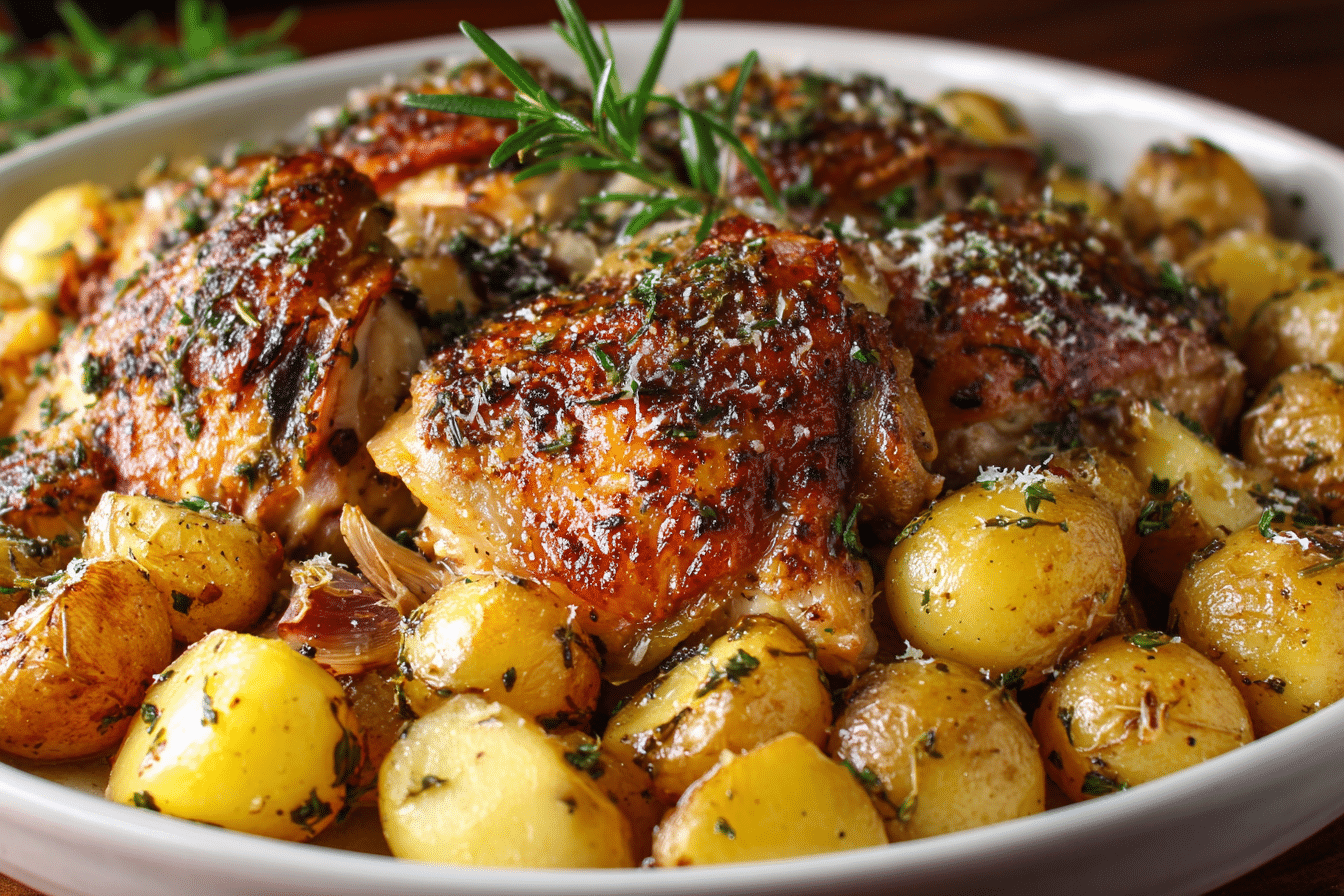 Garlic: Lots of it! Fresh garlic cloves provide that rich, mellow flavor that permeates both chicken and potatoes as they cook.