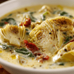 When you want something creamy, comforting, and a little elegant without feeling heavy, this Creamy Lemony Tuscan Artichoke Soup is the perfect answer. With tender artichoke hearts, earthy white beans, garlic, and a burst of lemon, this soup is smooth and silky, yet surprisingly light — a true Mediterranean-inspired bowl of comfort.