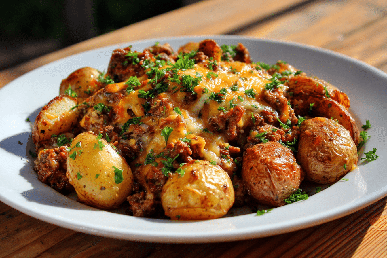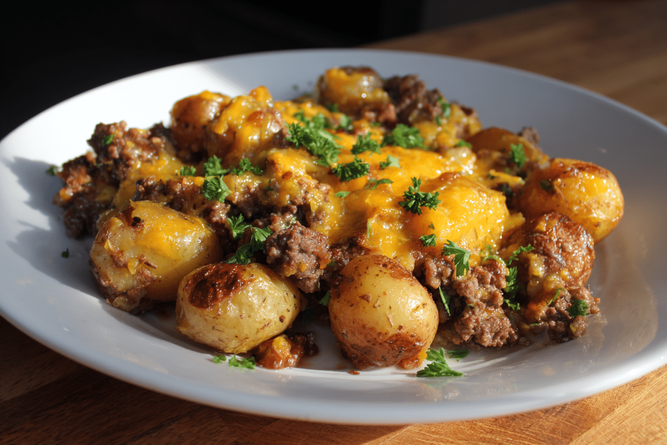 A hearty, creamy slow cooker casserole layered with seasoned ground beef, tender potatoes, cheese, and a comforting mushroom sauce.