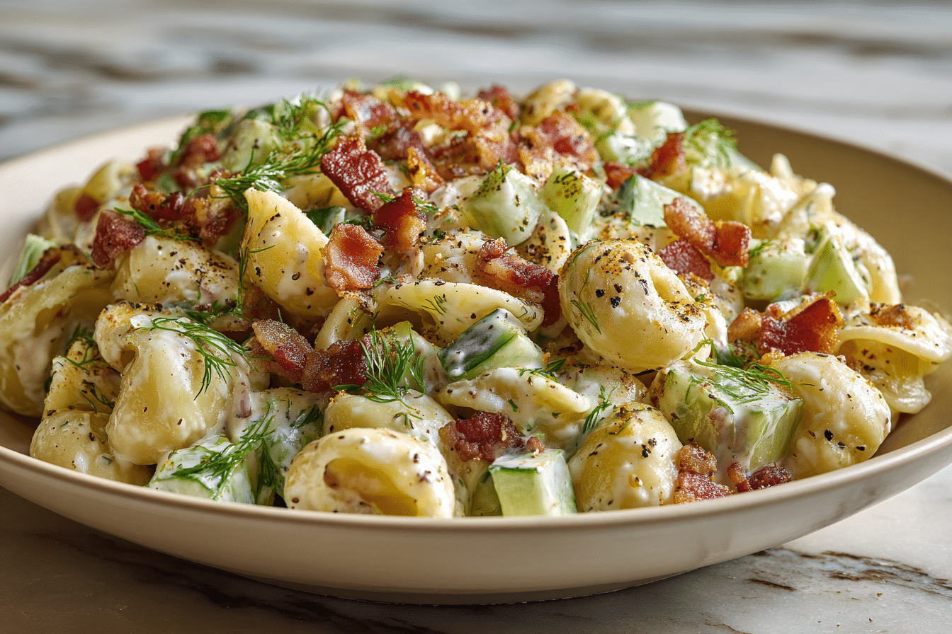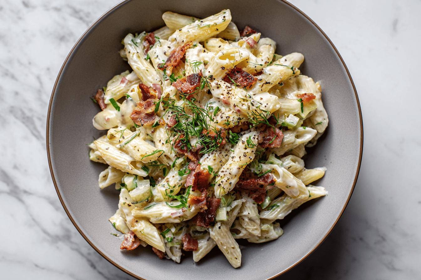 This Dill Pickle Bacon Pasta Salad is a bold, flavor-packed twist on classic pasta salad. It combines crispy bacon, tangy dill pickles, tender pasta, and a creamy dill dressing for a dish that’s crunchy, savory, and impossible to resist.