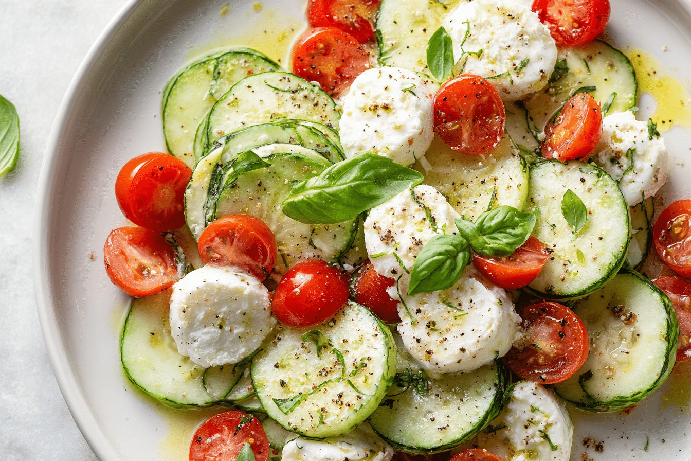 Easy Cucumber Caprese Salad is a fresh, vibrant dish that brings together crisp vegetables, creamy mozzarella, and fragrant basil in a light Mediterranean-inspired salad.