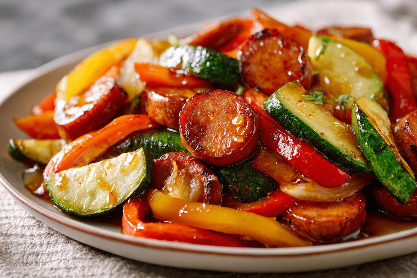 This One-Pan Honey Garlic Kielbasa & Veggies is a fast, flavorful dinner made with smoky sausage, caramelized honey garlic sauce, and roasted vegetables. It’s a true 30-minute, no-fuss meal perfect for busy weeknights.