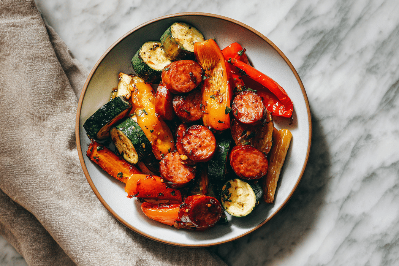 • Roast for 20–25 minutes, stirring halfway through, until veggies are tender and sausage is caramelized.