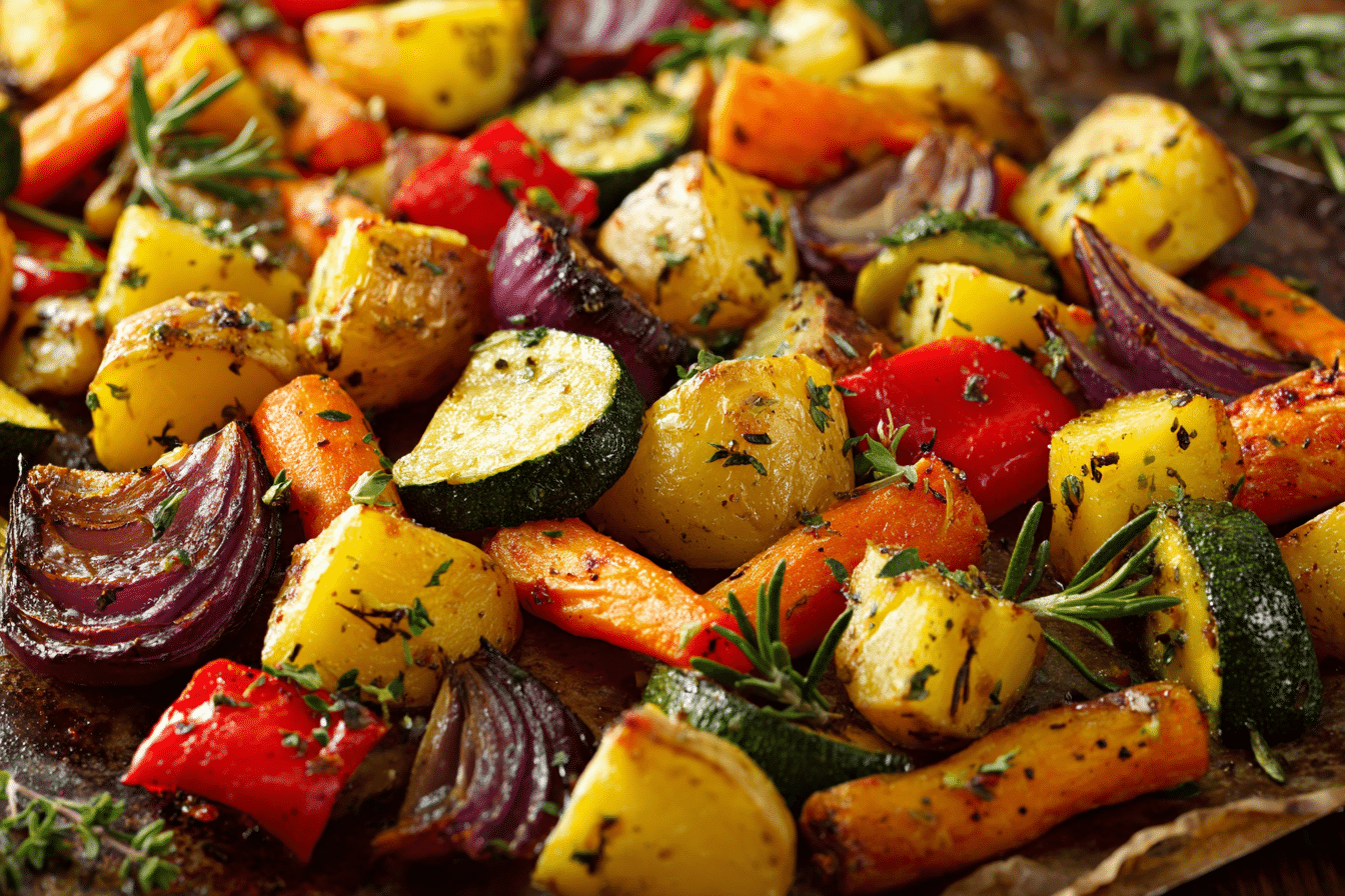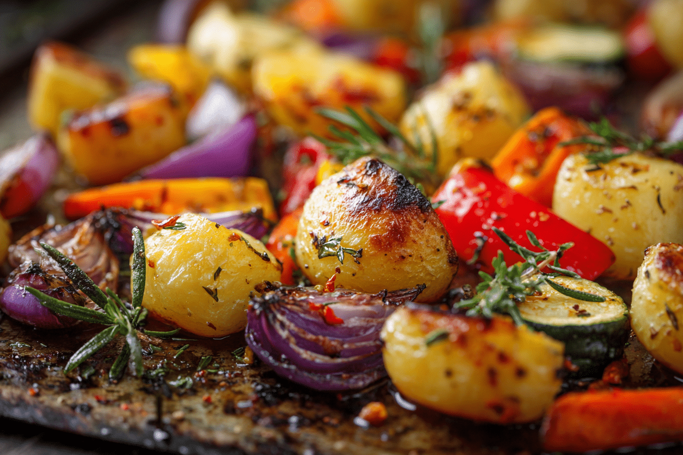 Spread vegetables in a single layer on the baking sheet. Roast for 25–35 minutes, stirring halfway through, until potatoes are golden brown and veggies are tender.