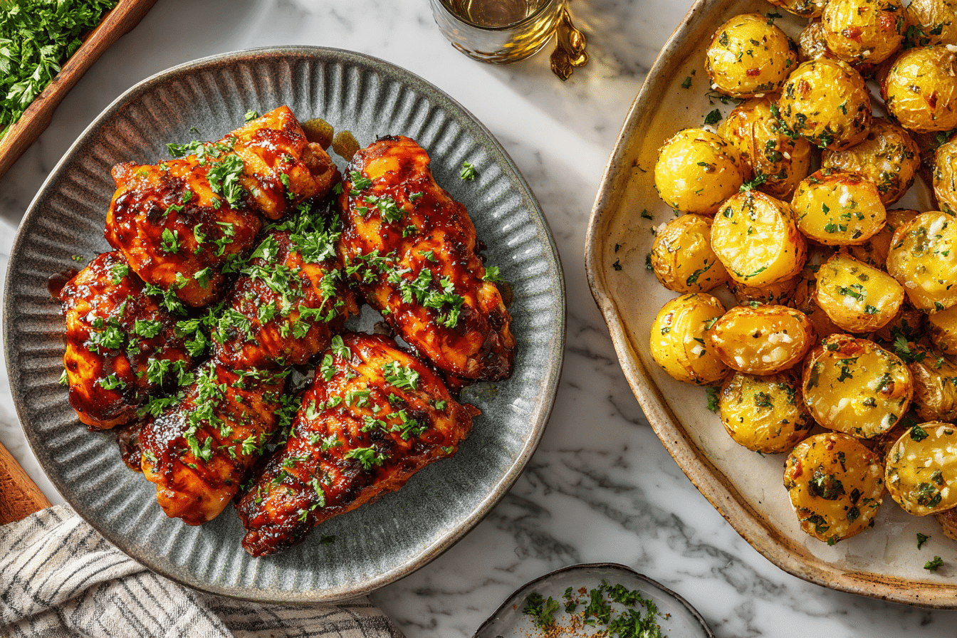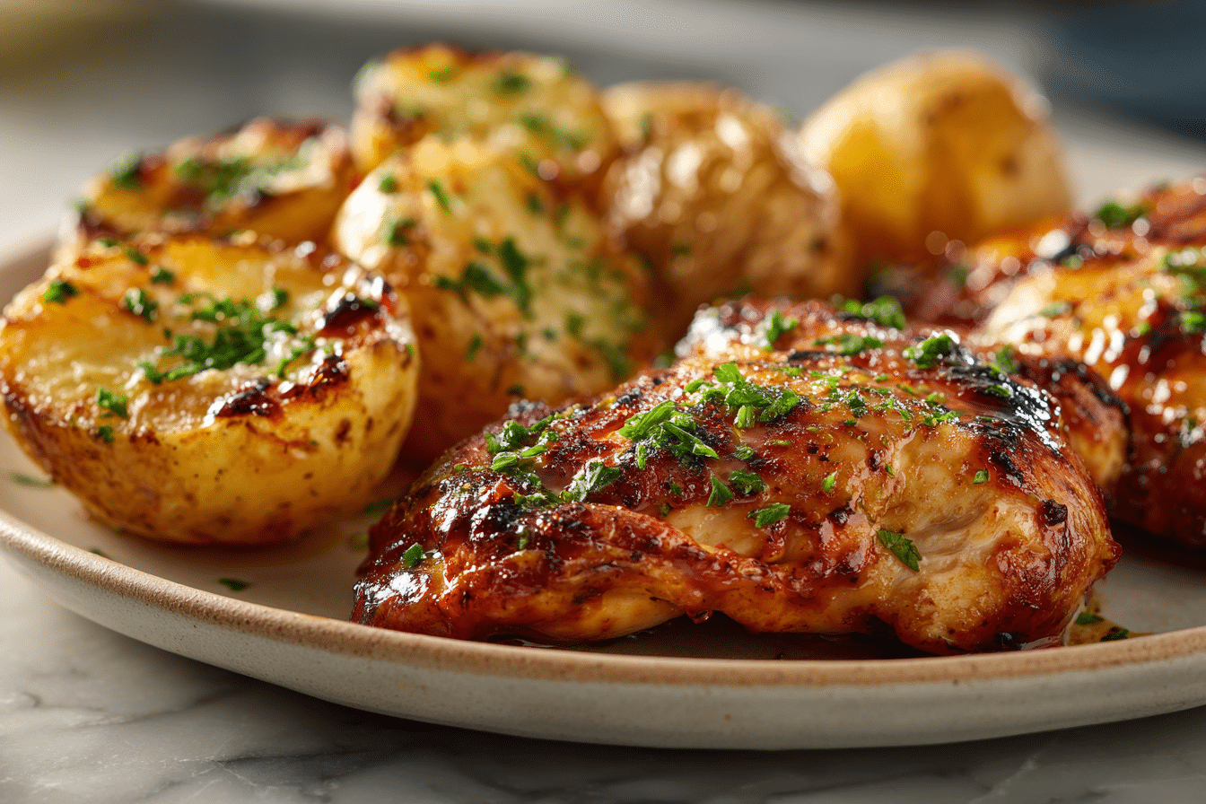 - Plate chicken with a side of garlic parmesan potatoes.
