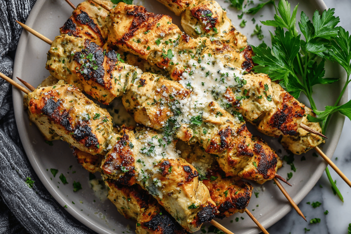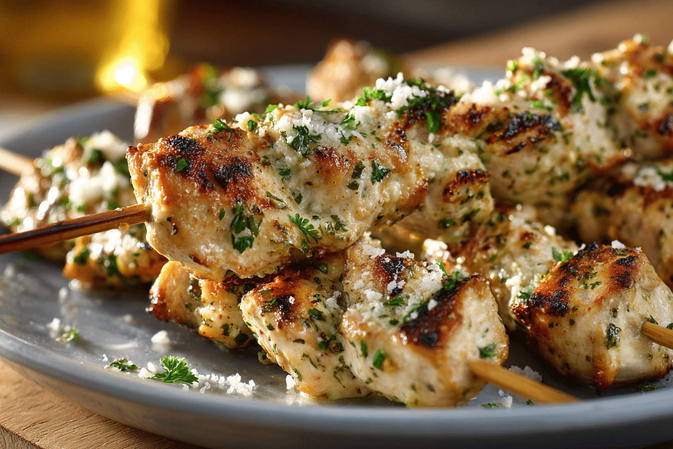 These Grilled Ranch Garlic Parmesan Chicken Skewers are juicy, smoky, and packed with bold flavor. Coated in a creamy ranch marinade, grilled to perfection, then finished with garlic butter and parmesan, theyβre perfect for BBQs, quick dinners, or meal prep.