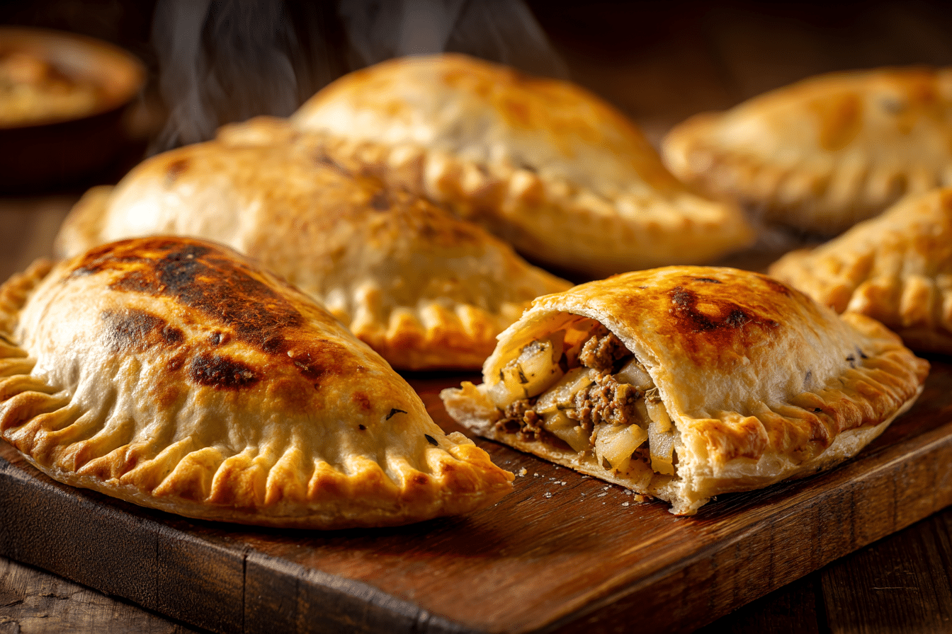This traditional version features tender beef, diced potatoes, onions, and herbs wrapped in buttery pastry.