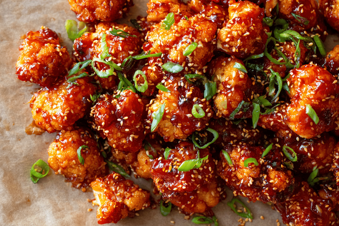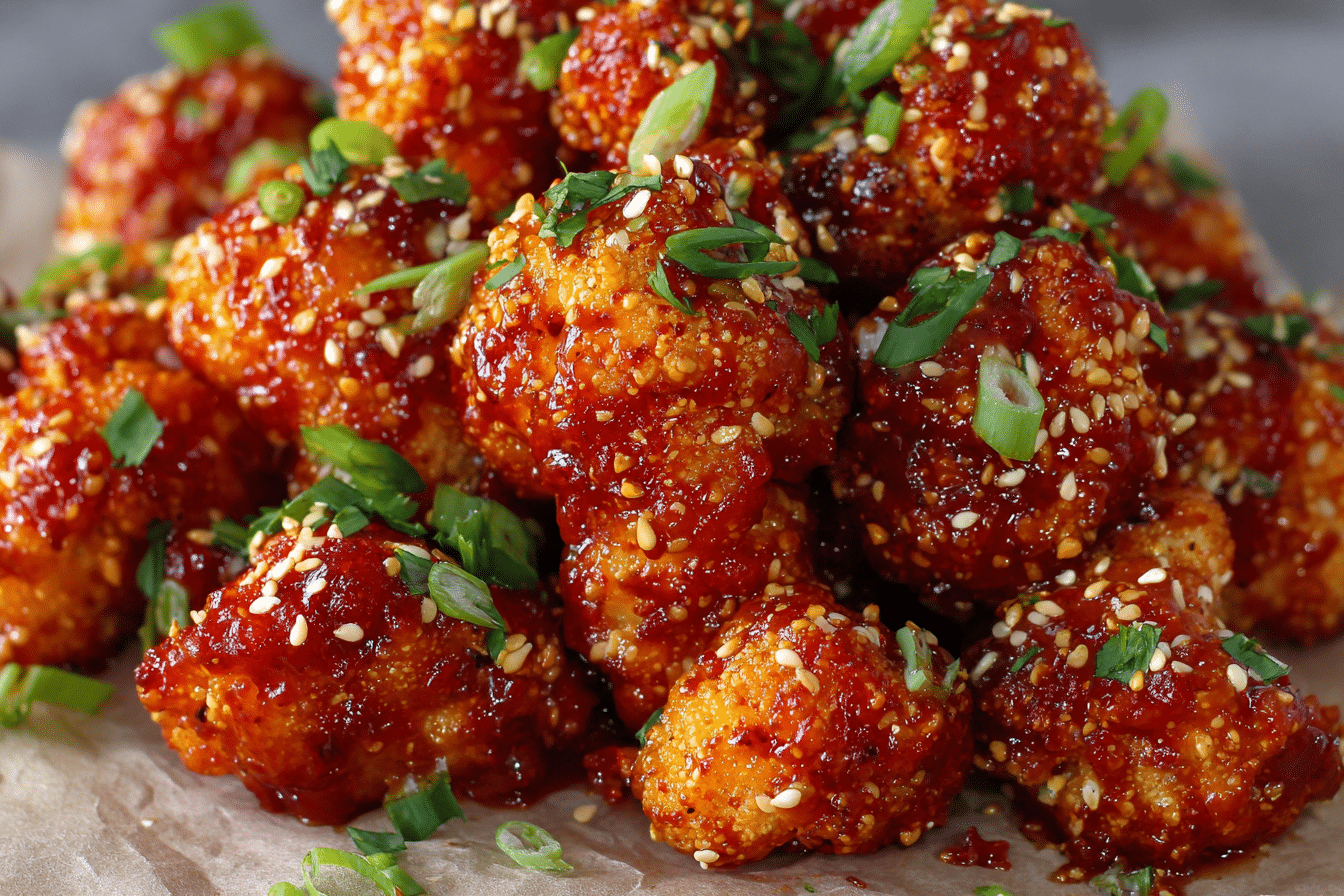 Roasted cauliflower florets coated in a sticky Korean-inspired gochujang glaze and baked until caramelized.