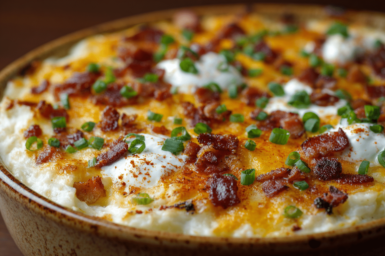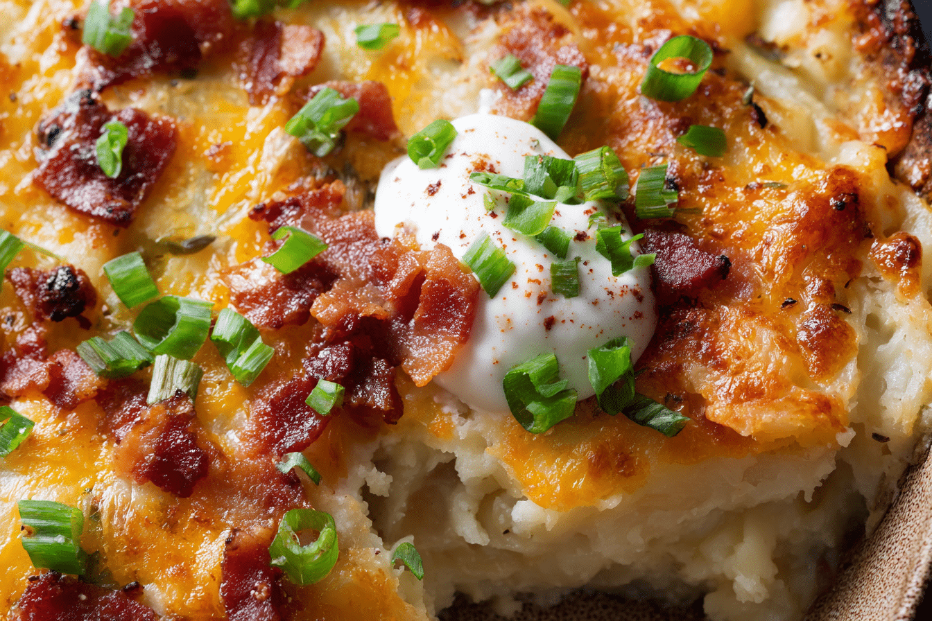 This Loaded Baked Potato Casserole takes the classic baked potato and turns it into a rich, crowd-pleasing casserole. Creamy potatoes are combined with cheese, bacon, and green onions, baked until bubbly and golden, making it the perfect side for holiday dinners, potlucks, or weeknight meals.