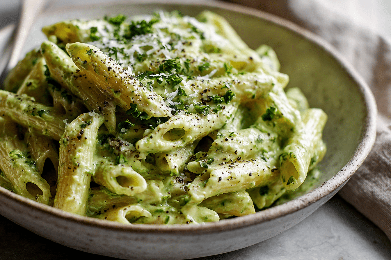 Whether you’re looking for a comforting vegetarian meal or a base to pair with grilled chicken, shrimp, or roasted veggies, this creamy pesto pasta delivers. The basil, garlic, Parmesan, and cream blend into a silky, savory sauce that’s both refreshing and cozy — a weeknight dinner win with minimal cleanup.