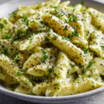 Whether you’re looking for a comforting vegetarian meal or a base to pair with grilled chicken, shrimp, or roasted veggies, this creamy pesto pasta delivers. The basil, garlic, Parmesan, and cream blend into a silky, savory sauce that’s both refreshing and cozy — a weeknight dinner win with minimal cleanup.