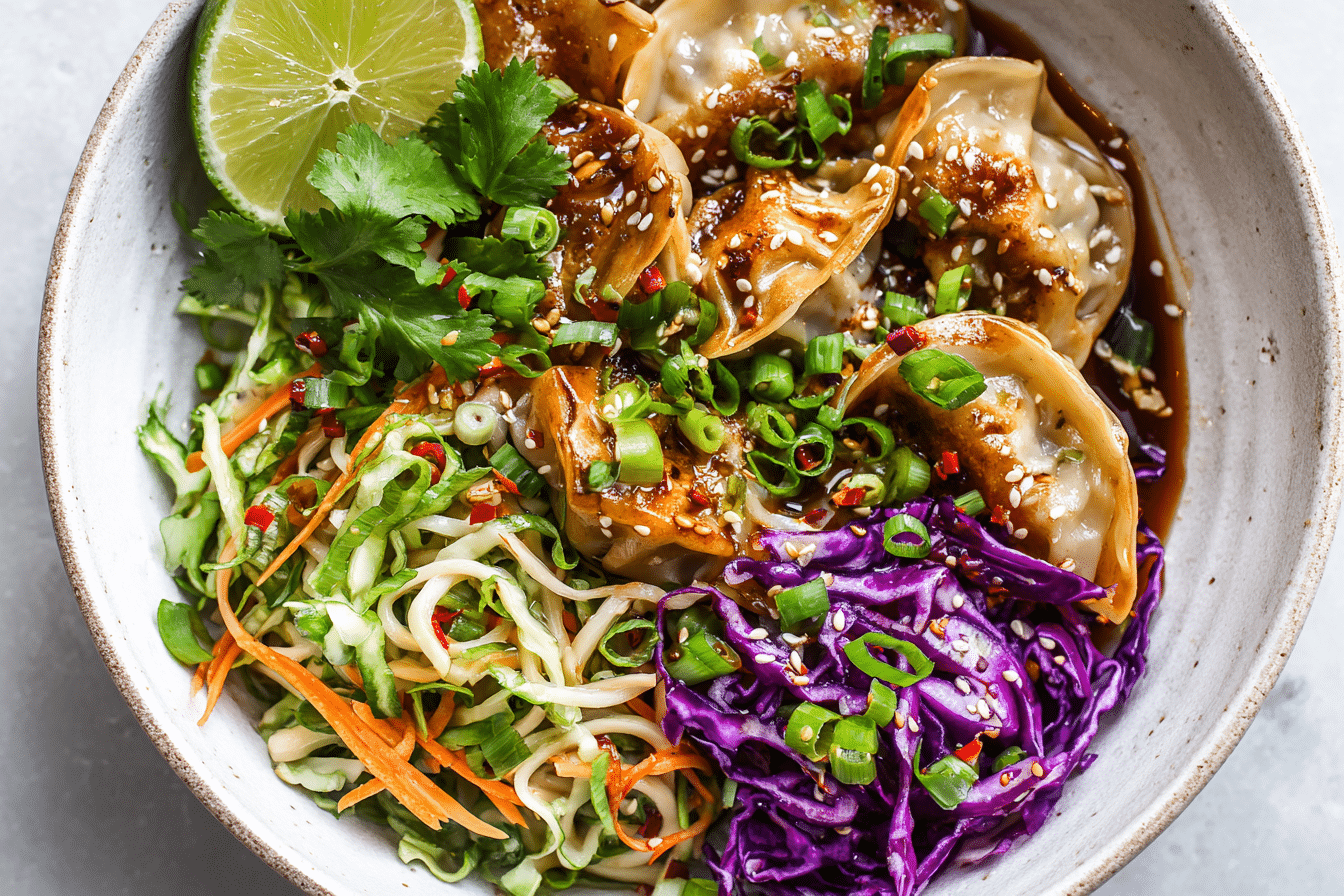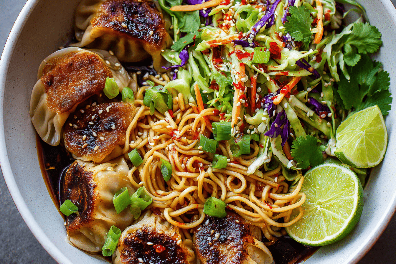 Potsticker Noodle Bowl with Pork & Cabbage Slaw is bold, savory, and packed with texture. With garlicky pork, tender noodles, and crisp slaw, it captures the flavors of classic dumplings in a quick, weeknight-friendly bowl.