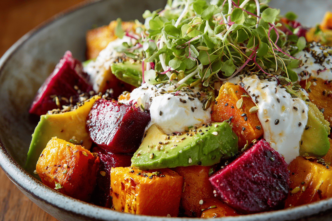 This vibrant, nutrient-packed salad combines earthy roasted beets, tender sweet potatoes, and creamy avocado with luxurious whipped ricotta and a bright lemon-tahini drizzle. Perfect as a light lunch, side dish, or dinner centerpiece, it’s beautiful, flavorful, and packed with wholesome goodness.