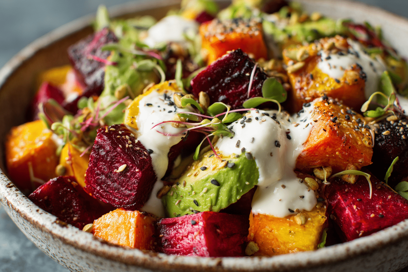 This vibrant, nutrient-packed salad combines earthy roasted beets, tender sweet potatoes, and creamy avocado with luxurious whipped ricotta and a bright lemon-tahini drizzle. Perfect as a light lunch, side dish, or dinner centerpiece, it’s beautiful, flavorful, and packed with wholesome goodness.
