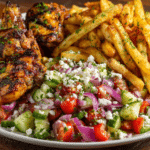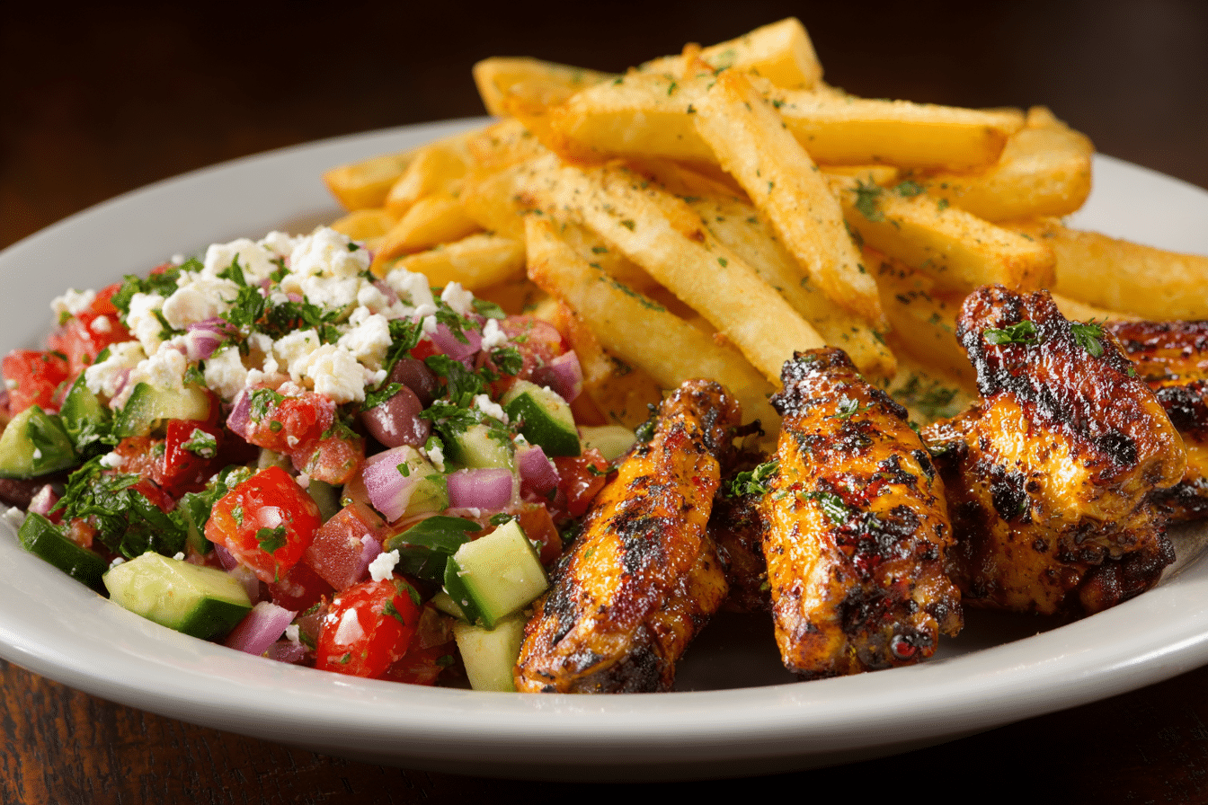 This dish brings together the best of all worlds: fire-kissed wings marinated in a punchy spice blend, hand-cut or frozen fries that are crispy and golden, and a vibrant salad full of briny feta, olives, and crisp vegetables. Each element balances the next—spice meets cool, richness meets freshness, and boldness meets crunch.