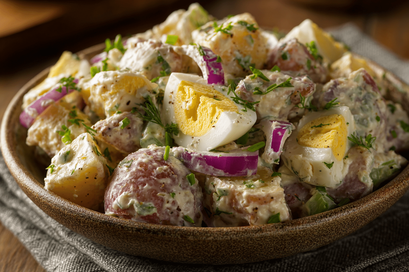 Combined, these ingredients create a hearty, flavorful, and crowd-pleasing potato salad.