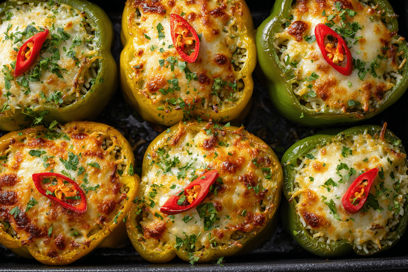 Tender bell peppers filled with seasoned rice and mixed vegetables, baked until soft and lightly golden.