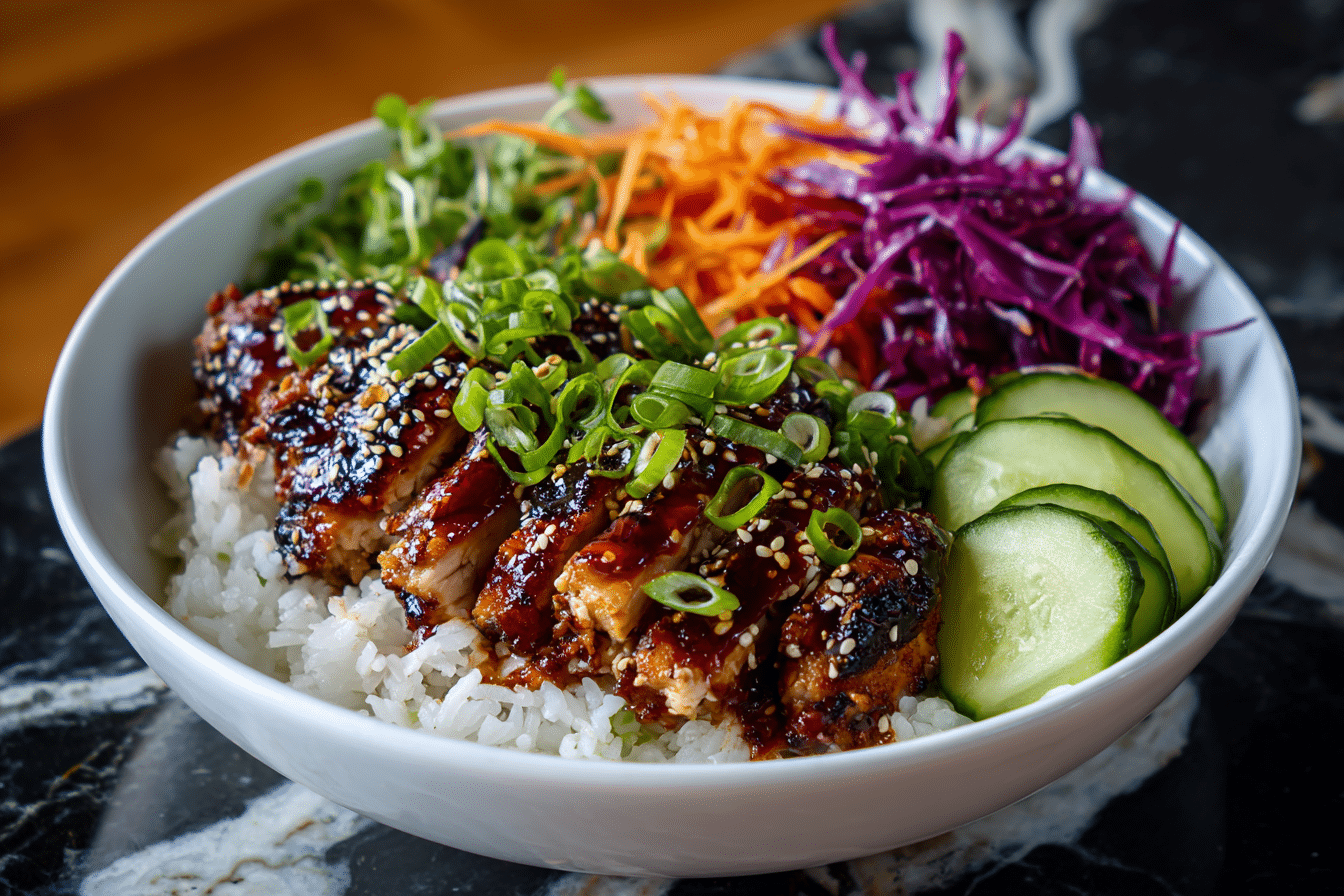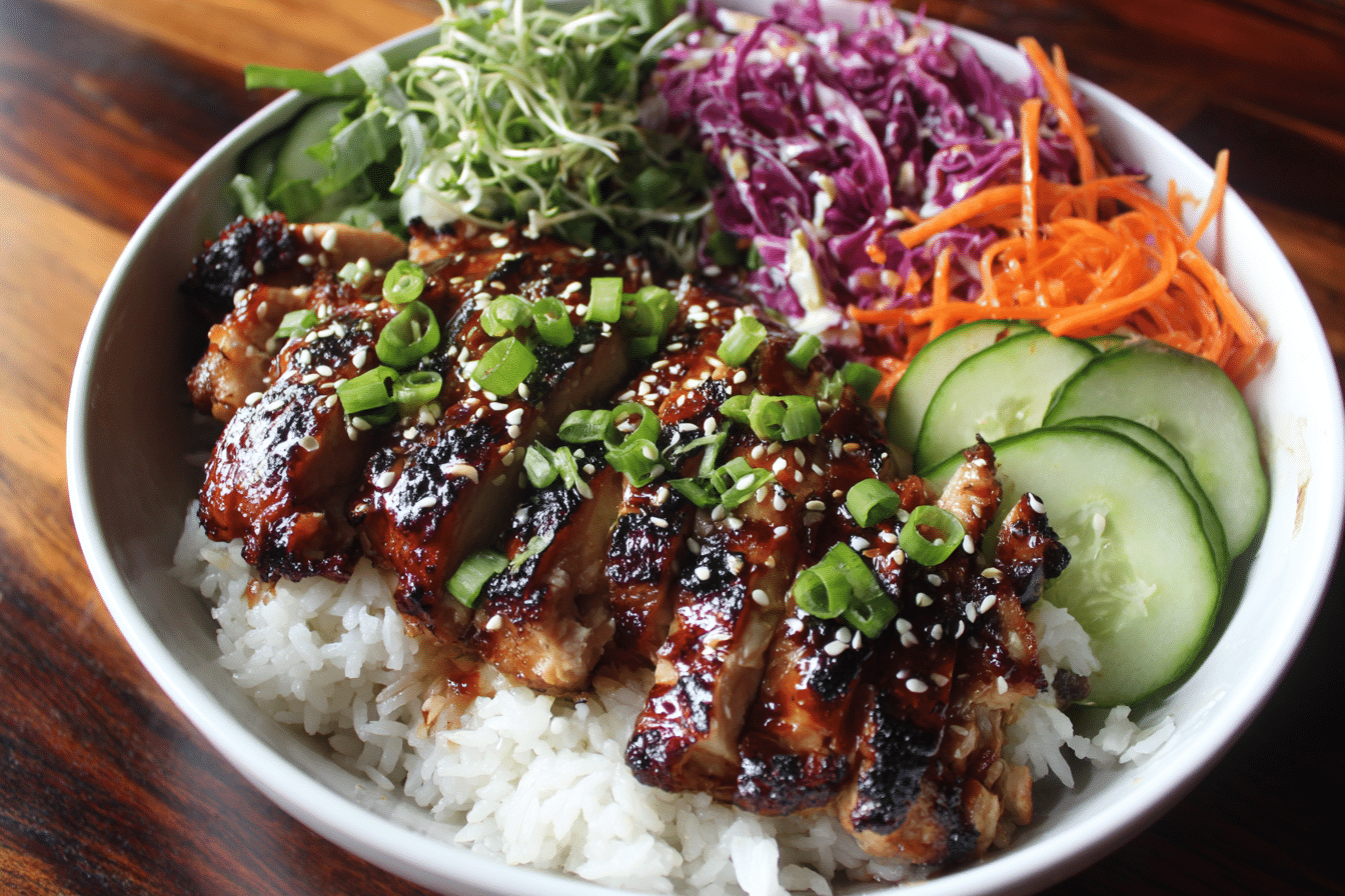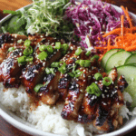 Juicy, tender chicken thighs are marinated and glazed in a glossy sweet chili sauce, then served over fluffy rice with fresh, crisp vegetables and vibrant garnishes. The contrast of textures — sticky caramelized chicken, soft rice, and crunchy toppings — makes every forkful crave-worthy.