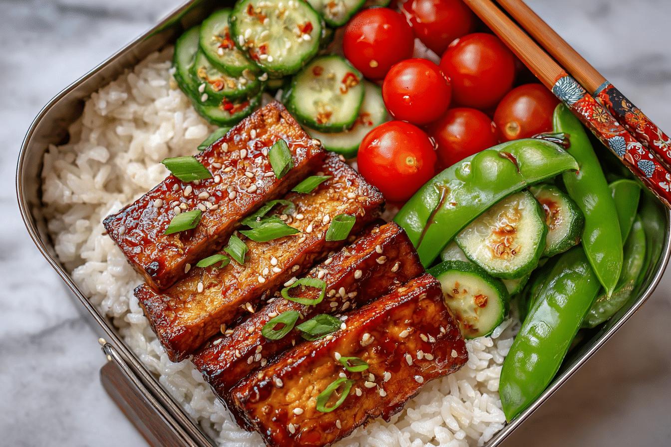 A flavorful and protein-rich vegan lunch idea featuring crispy tofu tossed in sticky teriyaki sauce, paired with rice, veggies, and fruit for a balanced bento box.