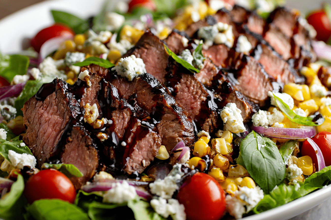 Ultimate Grilled Balsamic Steak Salad with Creamy Gorgonzola & Sweet Corn is bold, vibrant, and perfectly balanced. Juicy grilled steak is layered over crisp greens, sweet charred corn, and creamy crumbles of Gorgonzola, then finished with a rich balsamic glaze.